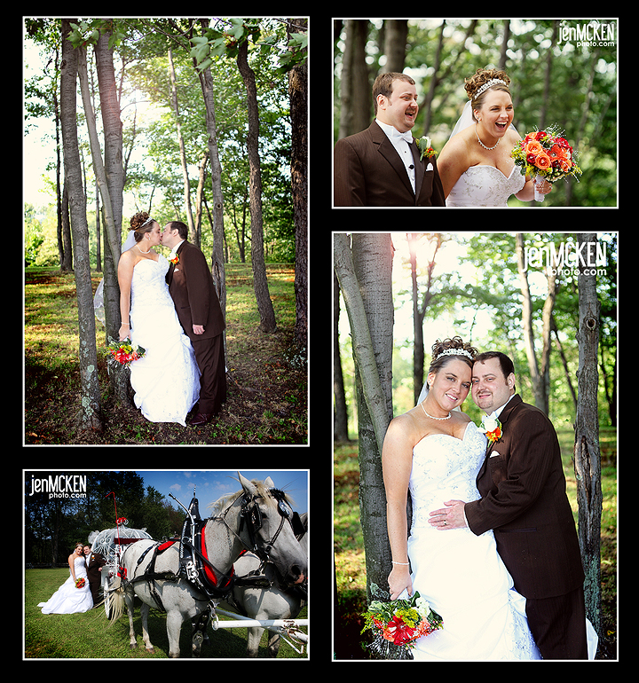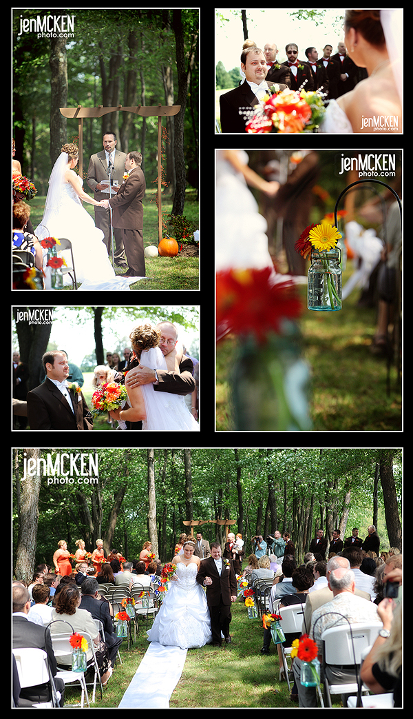 Becky and Matt had their ceremony in such a special spot…..her grandfather’s property. I was this little quaint field with a break of trees. It was among those trees that they exchanged their vows. As I looked around and scoped out the location, it was very apparent that they had spent A LOT of time preparing the property for the wedding day. I’m told Becky’s brother did most of the hard work and that they worked with the local Amish to get the fall flowers and other decor early to create the fall atmosphere. They knew that they wanted a fall theme but because August is too early in the year, preparations started last year with gathering the fall leaves and pressing them, ordering pumpkins, fall flowers……it was beautiful!