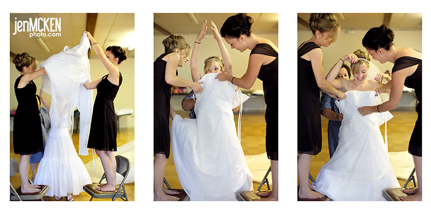 It takes a village…….to dress a bride! It’s true. AND….there’s a process, I mean it doesn’t “just happen”, these things take …well…..a systematic approach! Getting a bride dressed is an art form in it’s own. 🙂 Men, I hope you can appreciate this! LOL