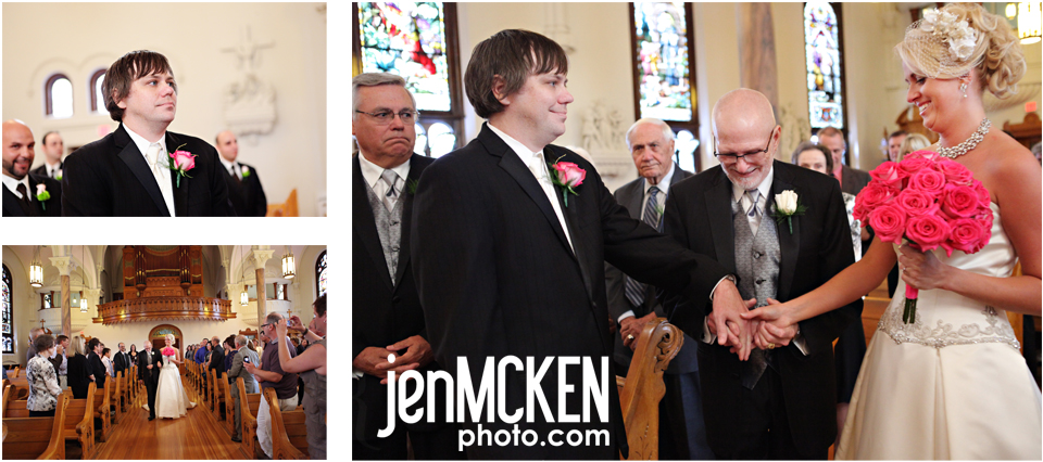 The church was gorgeous, her dress was gorgeous……the day was gorgeous…ultimately, it was a perfect day! Their ceremony took place in St. Joseph Chapel at Seton Hill. Inside the chapel it was flooded with natural light and the architecture of the ceilings and all the details were amazing!  I LOOOOOOVE the shot of her Dad giving her away….gahhhhh!!!