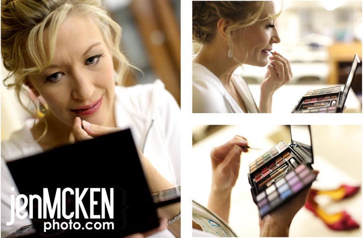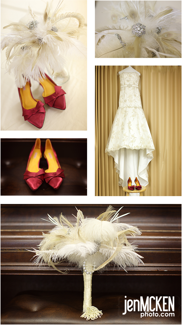 They should be leaving for their honeymoon tomorrow but I wanted to at least hop on and post a few of the “getting ready” shots before they get on the plane. I want to start off by saying that I LOOOOOOVED her bouquet. It was full of feathers and rhinestone pins and it was fabulous. The brides maids had similar ones but theirs had a splash of black. The other thing I loved were her shoes. The entire wedding was whites, creams, black…..with a splash of red. It was very clear that they pulled out all the stops when it came to the details. AAAAAND, she’s gorgeous. I know I mentioned on facebook….I honestly think she resembles Carrie Underwood-just sayin! 🙂
