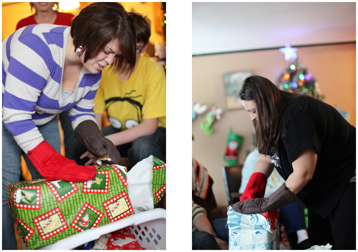 All 11 of us gathered in a circle on fold up chairs in the living room to play pass the parcel, exchange white elephant gifts and to play other cheesy Christmas games that included opening gifts with oven mits -it was so much fun! Growing up my Dad never really paraticipated in things like this. You could usually find him out in the garage tinkering with the cars, fixing something but you wouldn’t catch him playing “warm and fuzzy” games with the family. Over these past few years, I’ve seen a total transformation……he not only participated, but he enjoyed himself and laughed-especially when his white elephant gift was a pair of women’s Christmas socks.