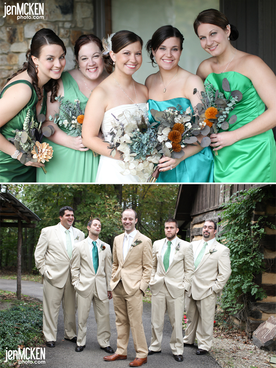 Her only rule was: they had to be green. This is what she told the bridesmaids when picking out their dresses. As long as they picked out a short dress and it was ANY shade of green she would be happy…and I have to tell you…I LOOOOVE the way they looked together! No ones was from the same designer, no ones was the same color green and all the ties matched each dress perfectly!  And the guys…don’t they look DASHING!!! 🙂