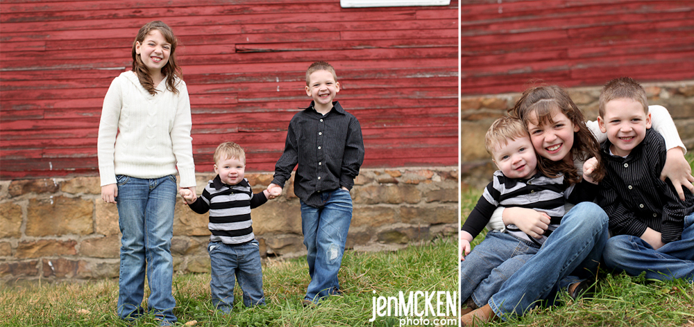 If they look just a wee bit familiar it’s because I shot their wedding several years ago-but it feels like it was just yesterday! I remember their wedding very vividly and my polka dot umbrella! 🙂 All these years later, their itty bitty’s aren’t so “itty bitty” any more and they have a new member of the family. Can you tell they aren’t shy in front of the camera!? We sang songs, picked on Dad and laughed…..you can hardly tell it was a dreary typical southwestern, pa fall day!