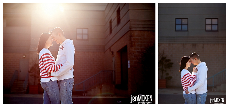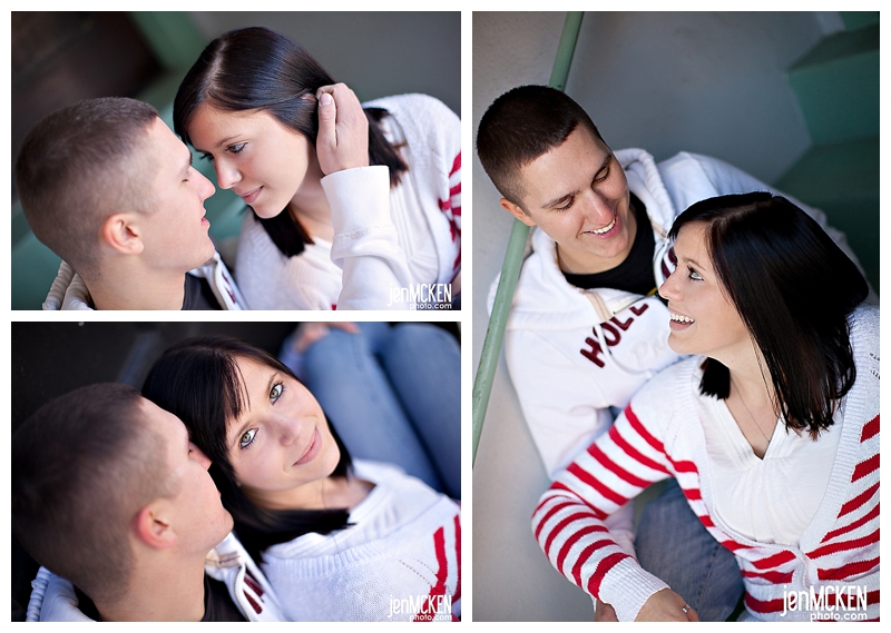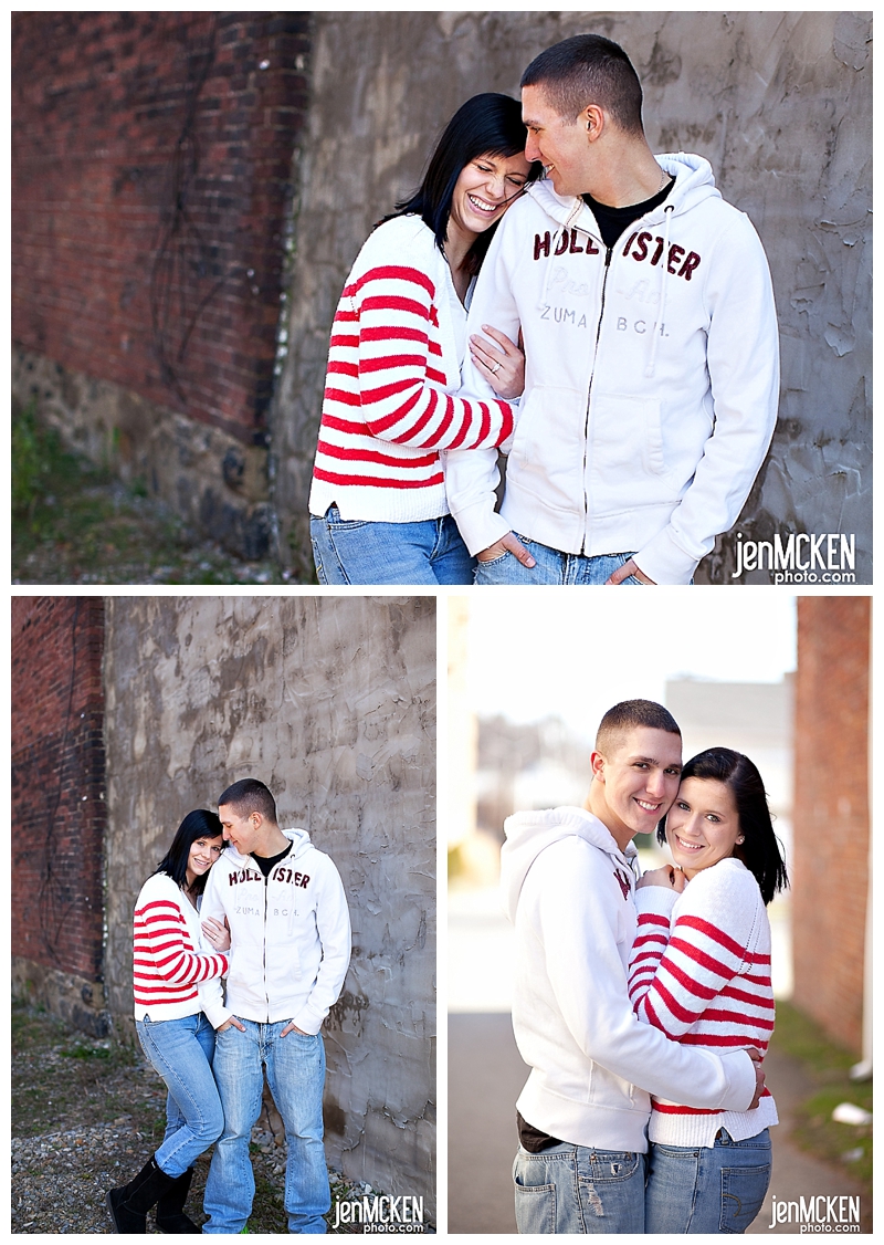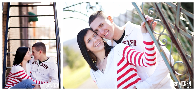 They’ve been away from each other now for six months-although if you ask either one of them, they’ll tell you it seems like MUCH longer. Patric returned home from Washington where he’s stationed-he’s in the Army and as with any other military family around the holidays, they are cherishing the time they get to spend together. He leaves to head back a few days before Christmas. They are among the thousands of people who will be away form their loved ones over Christmas! I’m honored that they asked me to shoot their engagement portraits and even more so that they spent the time with me out in the cold! It was 30 degrees here in southwestern, PA on the day we shot these. As someone commented on my fanpage wall, “love raises the temperature”. I guess one advantage to having colder weather, is that you have to cuddle even more than usual just to keep warm. 🙂