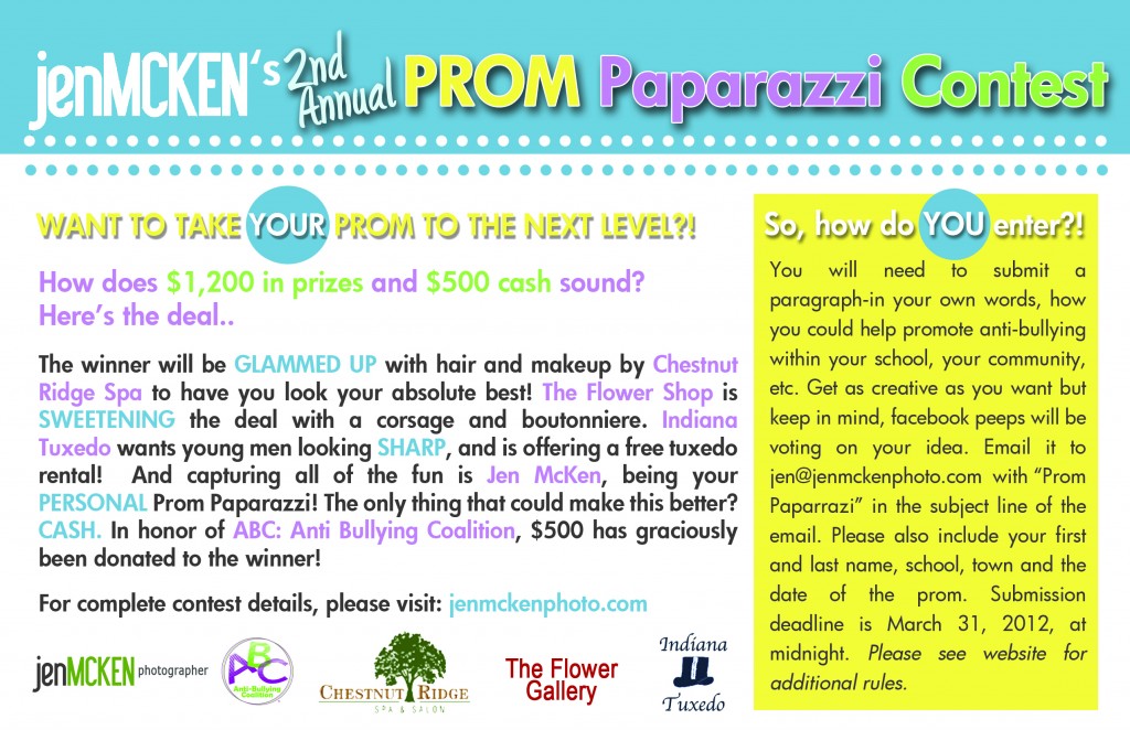 9. The winner must be attending 2012 prom within Indiana County. If the chosen winner does not go to Prom the second runner-up will be the new winner and so on. By entering the contest, you allow jen mcken photography, Chestnut Ridge Resort and Spa , The Flower Gallery, Indiana Tuxedo and the ABC-Anti Bullying Coalition to display photographs on the blog and facebook or webpages. In the event that jen mcken is not available on the date of the winner’s prom, a substitute session will be provided at a later date.