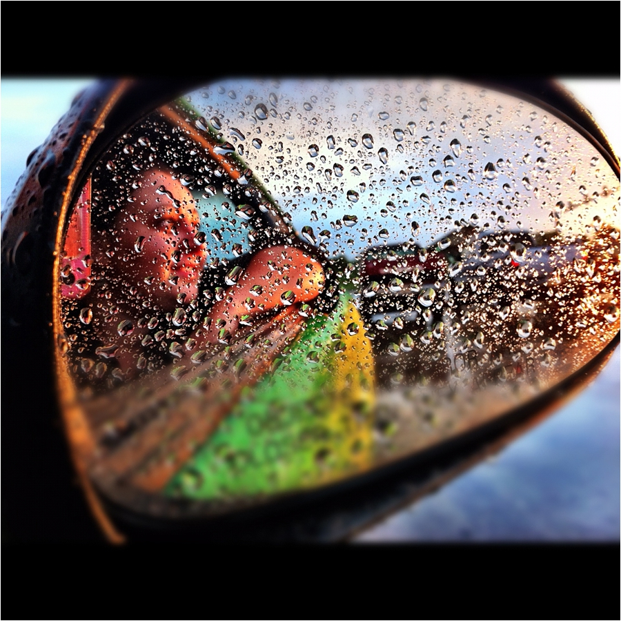 Out for a drive in the green Mustang…one minute is was raining cats and dogs and then the next the sun is shining! I love this picture of me thru his side mirror! I think I just love the colors of the green car, the blue sky and then the little water droplets!