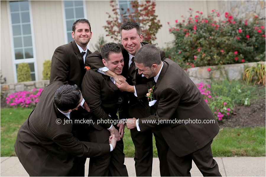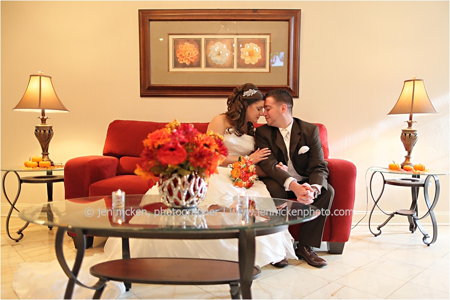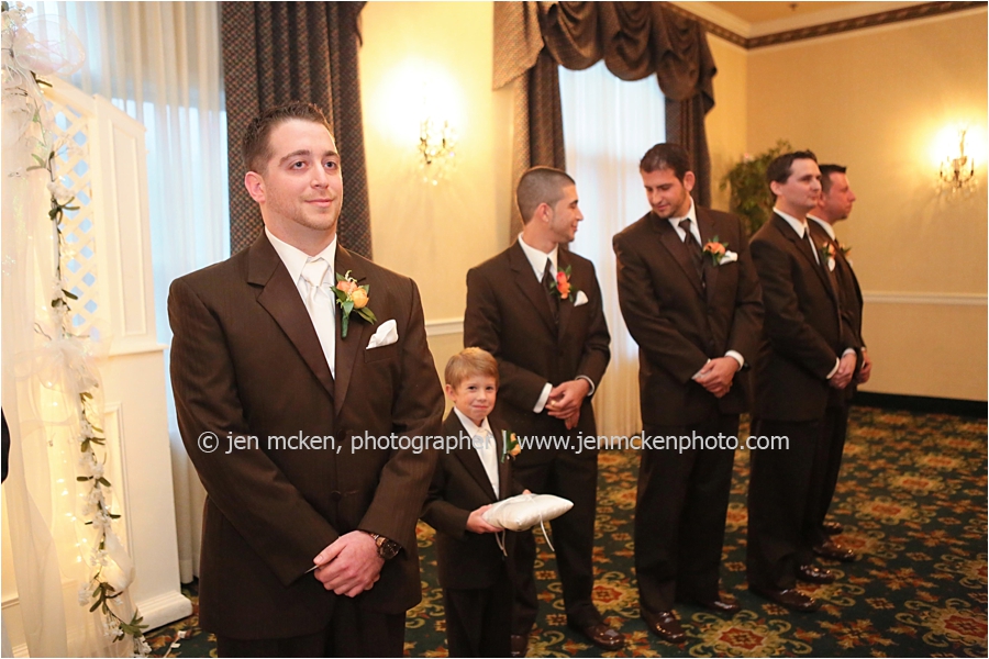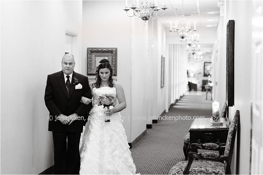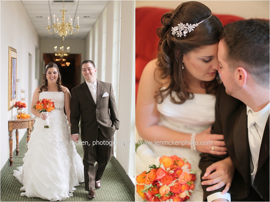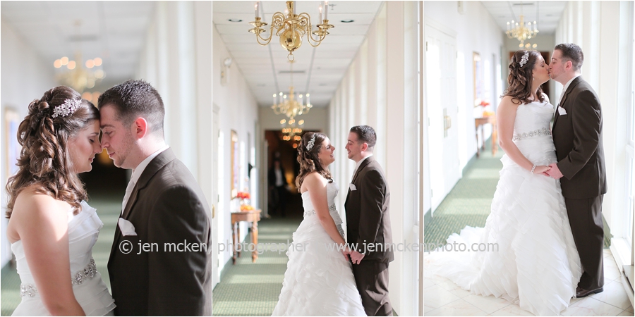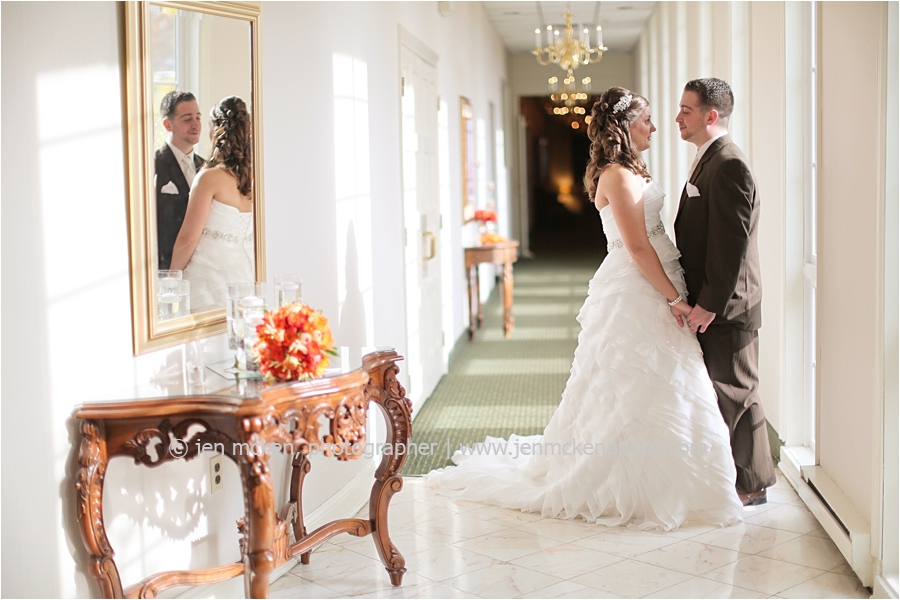 We really lucked out on the weather ……Hurricane Sandy was slowly moving up the East Coast and I’d be lying to you if I told you I wasn’t nervous that it would be wet and gloomy the day of the wedding. It was actually quite a beautiful day, with big white puffy clouds…and no rain! Because Scott and Casey had both their ceremony and their reception at The Blair Mill Inn, we stuck around the grounds of the venue for portraits. The lighting in the hallway was scrumptious!! 🙂