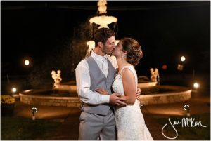 bride and groom share an end of the night kiss in front of the fountain at chestnut ridge